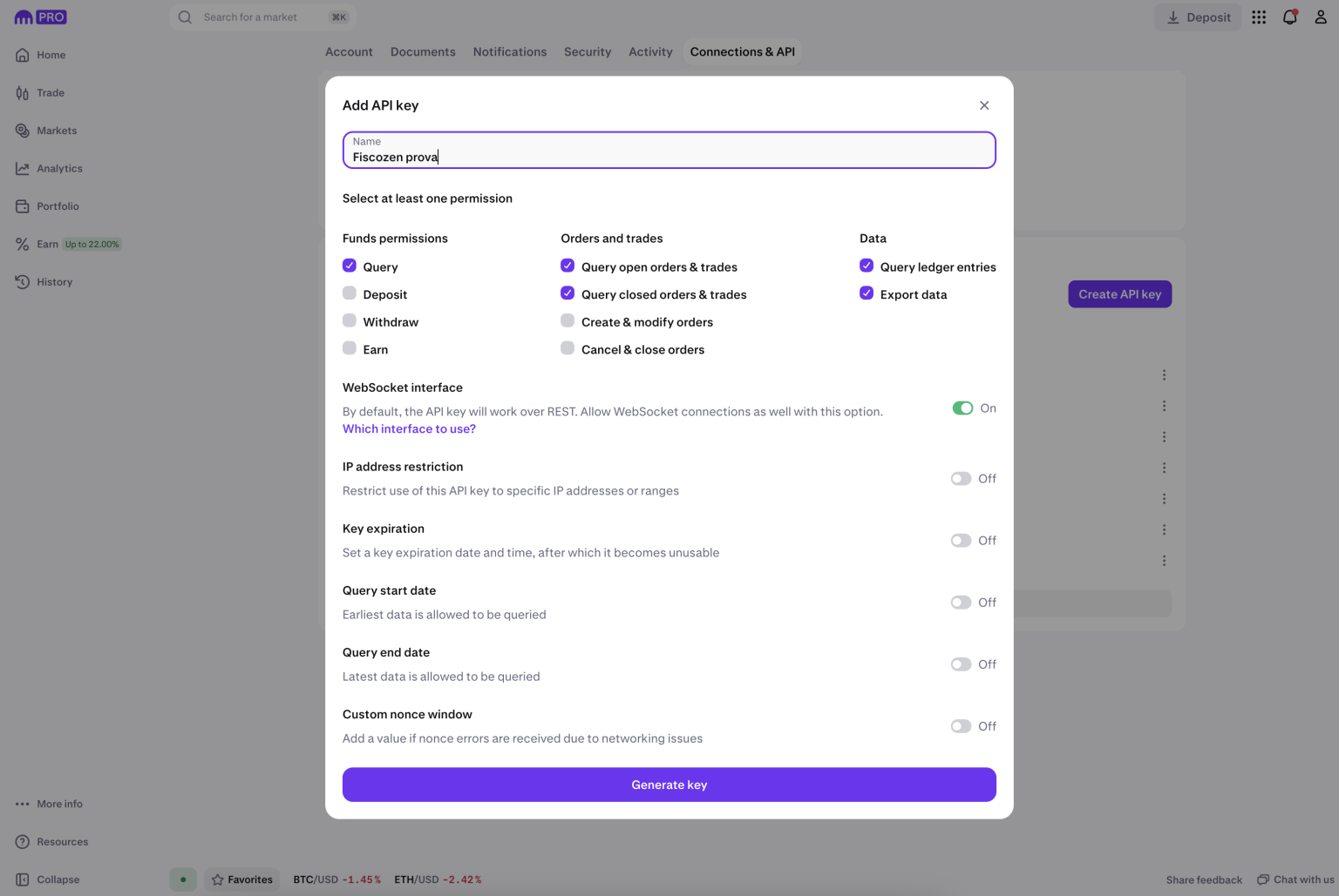 - Clicca su “Generate Key” o “Genera chiave“