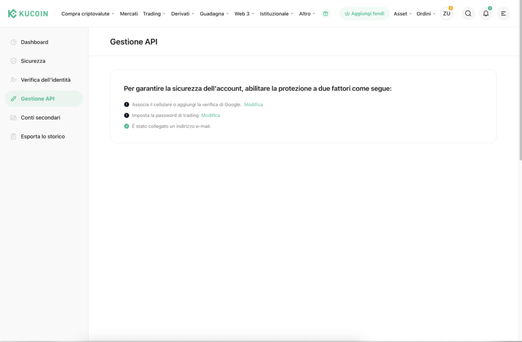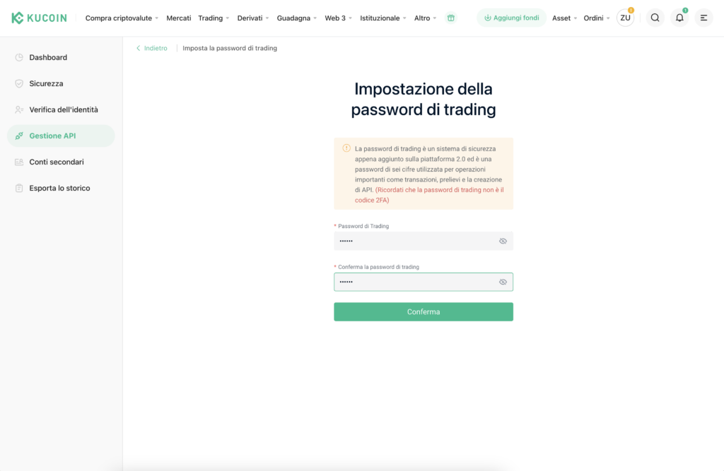 - Crea una password di trading. Ti servirà per generare la chiave API